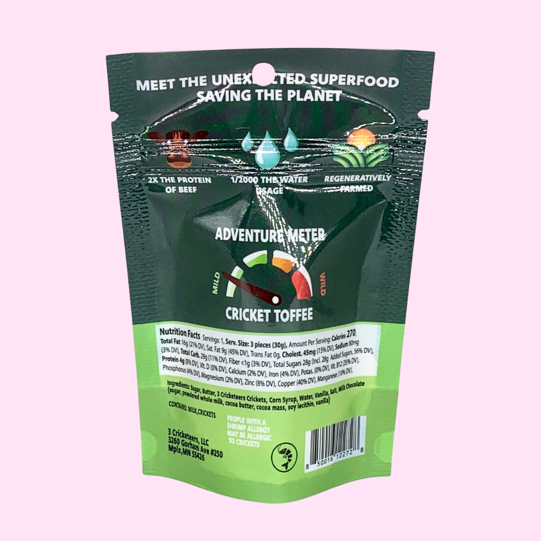 Sweet, crunchy, and delightfully adventurous! We mix our roasted crickets—known for their naturally nutty flavor—with buttery toffee and silky milk chocolate for a treat that surprises in all the best ways. Perfect for snacking or sprinkle it onto your favorite desserts for a fun, delicious and exciting twist.